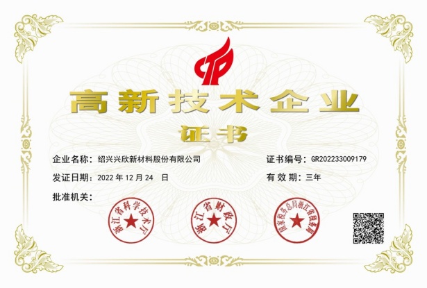 紹興興欣新材料股份有限公司成立于2002年06月27日,占地面積122畝,位于杭州灣上虞經濟技術開發區拓展路2號,現有職工200余人,專業技術人員50余人;博士、碩士研究生30余人組成的一支知識型、專業化的技術科研團隊。公司面向全球市場,專業開發電子化學品、環保化學品、醫藥中間體、高分子材料等先進新材料重點領域的省級科技型企業;建有浙江上虞、安徽東至兩個生產基地。目前為“國家高新技術企業”、浙江省“隱形冠軍”企業、浙江省專精特新中小企業;建有“省級”研究開發中心,共建天津大學浙江紹興研究院電子化學品研發中心。